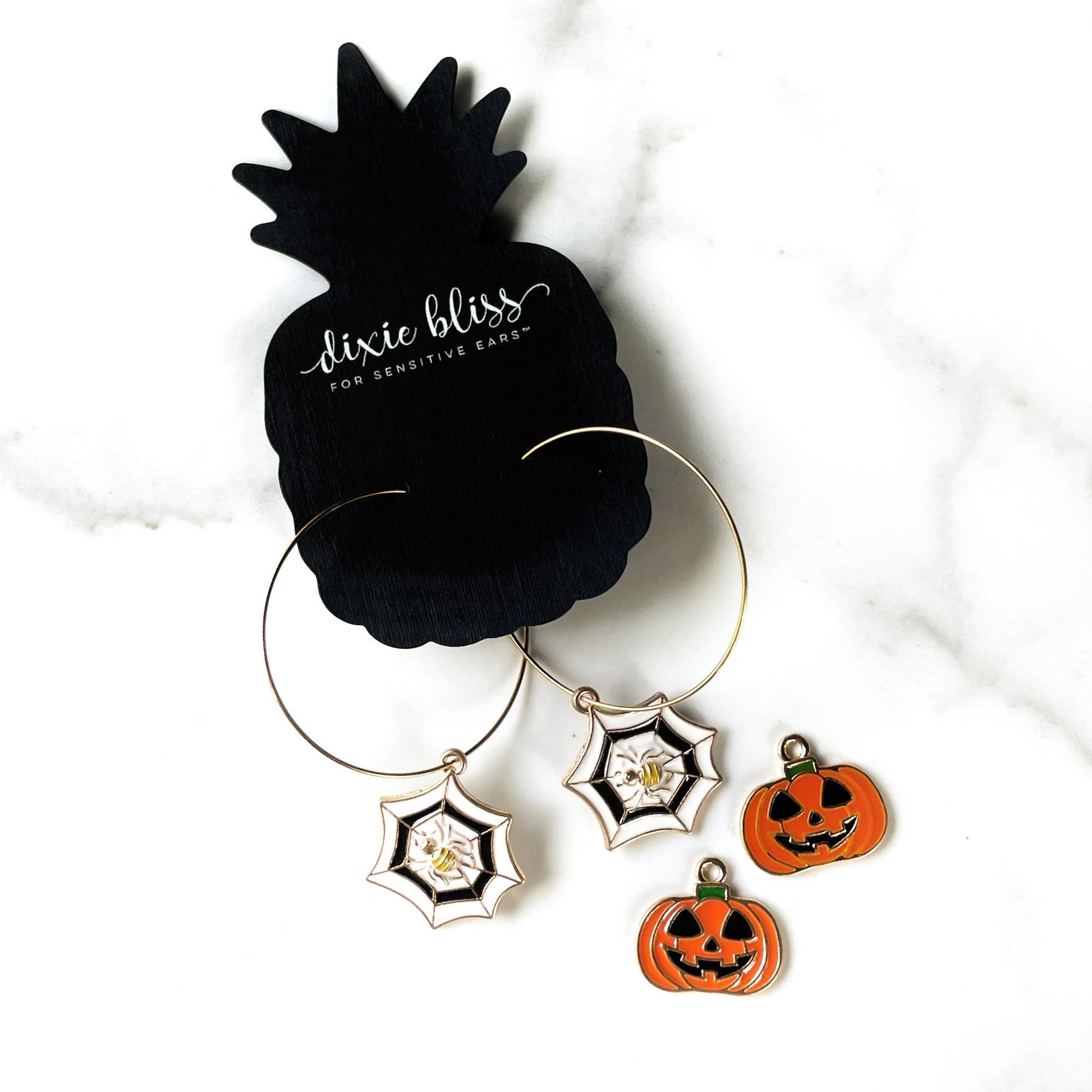 *Interchangeable Jack-O-Lantern and Spiderweb Charms *Measures 2.6" including charm *Loop closure *Rubber back included for extra security *