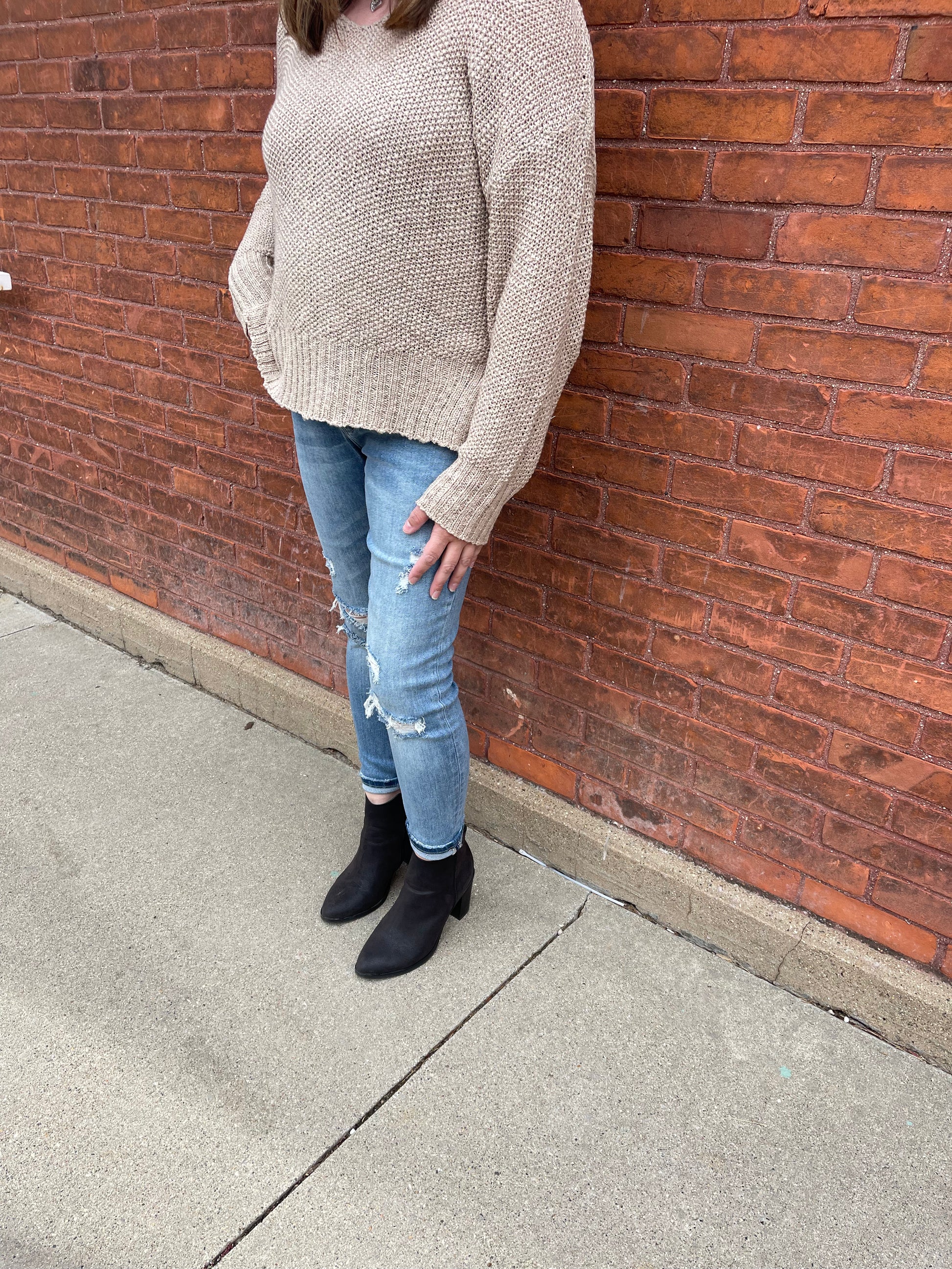 MID RISE ANKLE SKINNY - COMFORT STRETCH DENIM, MID RISE, ANKLE LENGTH, DISTRESSED DETAIL. MEDIUM WASHED